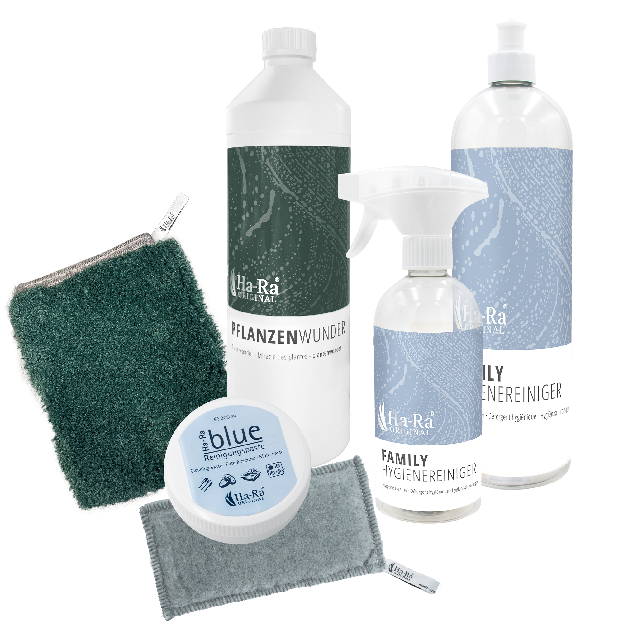 » 25 – 50 ml auf 5 l Wischwasser geben und mit einer Ha-Ra Faser oder einem Ha-Ra Tuch wischen.